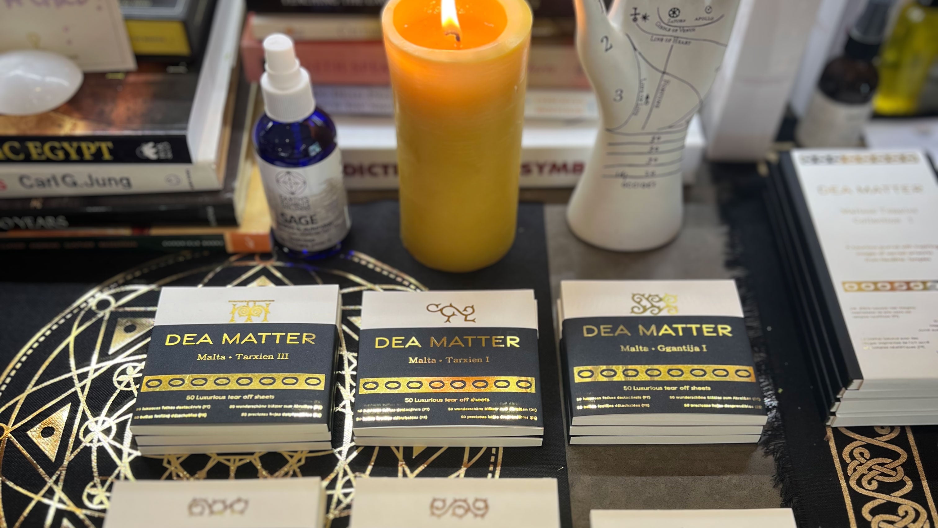 The DEA MATTER (Mother Goddess) collection explores ancient sacred symbols in prehistoric sites associated with the Great Neolithic Goddess, revered from the Mediterranean Rim to the Irish and British Islands.